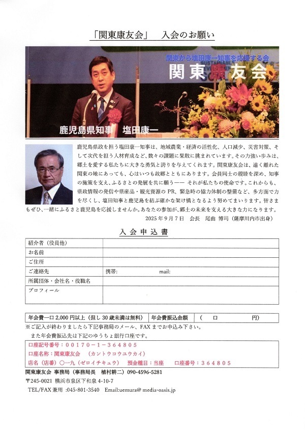 当会は関東を中心に彼の誠実・着実に県政を行なう人柄を慕い、彼の生き方を通じて自分の素養を高めようとする目的に向けた情報発信と、仲間相互の親睦をはかることを目的とし講演会、異業種交流会を開催します。関東から塩田康一知事を応援する友の会として「関東康友会」と命名しました。これから多くの仲間を増やしていきましょう。