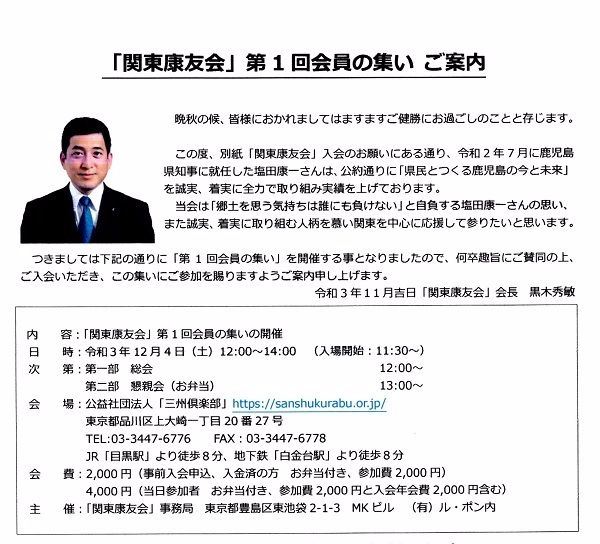さて、「関東康友会」では設立総会兼第1回会員の集いをオンライン参加も踏まえて下記の通りに開催いたします。ご多用中恐縮に存じますが、ご出席くださいますようご案内申し上げます。