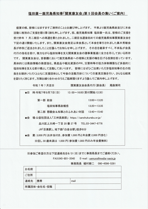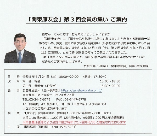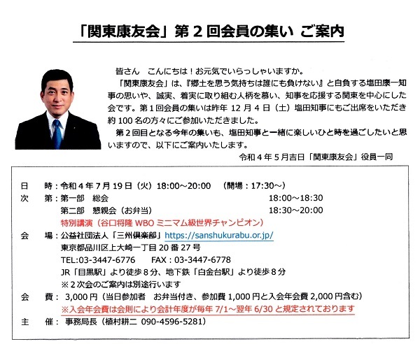 当会としては塩田知事にはもっともっと県政でご活躍いただきたく全面的に応援したいと考えて下記のように「塩田康一県知事を囲んで県政報告&激励会」を開催することになりました。ご多忙のところ誠に恐縮ですがご出席を賜りますようお願いいたします。