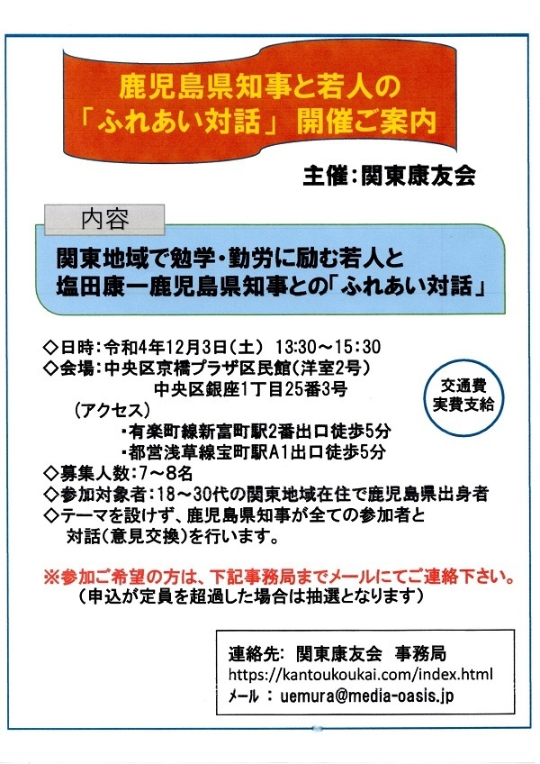 | 内 容:鹿児島出身で関東在住の若人と鹿児島県知事との「ふれあい対話」 |