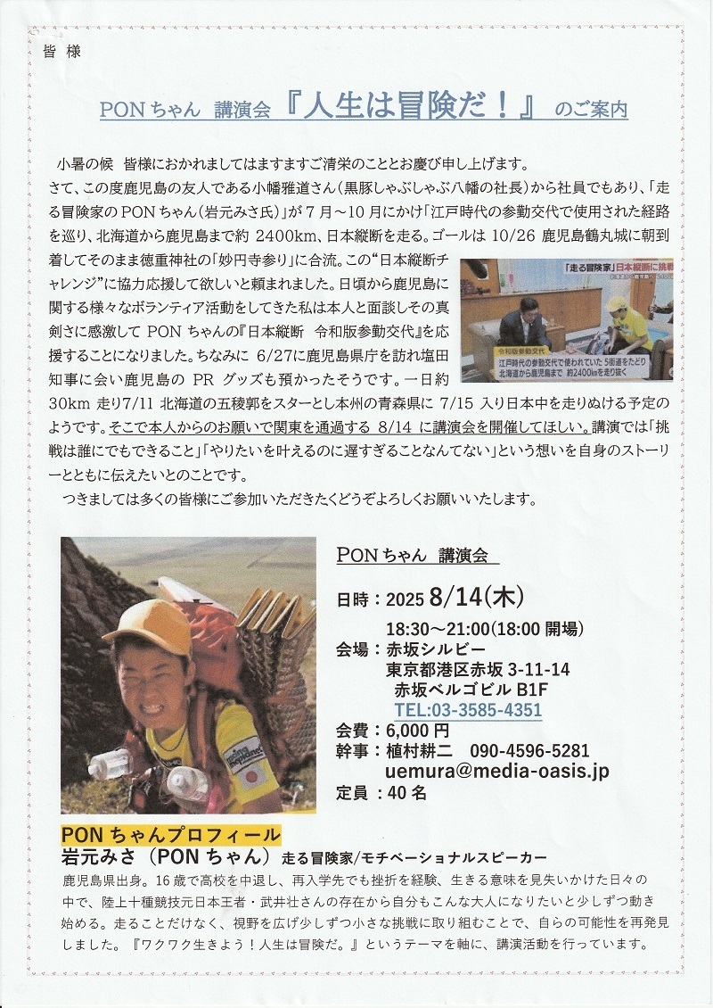 皆様 塩田知事応援仲間の走る冒険家「PONちゃん」の講演会を下記の通り開催します。PONちゃんはこれまで、2018年サハラ砂漠マラソン237km完走、2023年6月モンゴルゴビ砂漠ゴビマーチ250km完走、2024年12月南極マラソン154.2kmフィニッシュして、今回7/11に函館から出発し、10/26鹿児島まで2400km走りぬけます。ちょうど8/14に関東を通過につき講演会を企画しました。ちなみにこの計画を6/27に鹿児島県庁を訪れ塩田知事に告げ、知事から鹿児島のPRグッズも頼まれたそうです!是非、講演会にご参加ください。