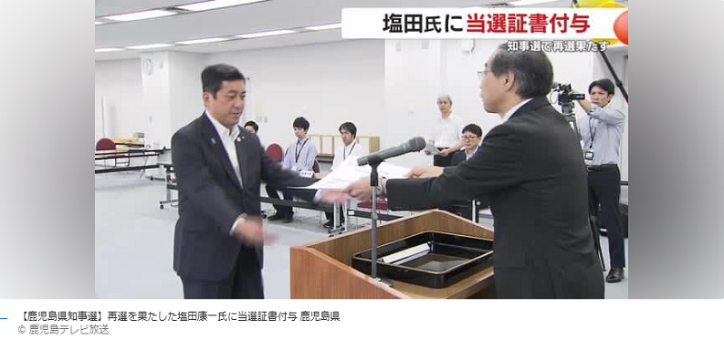 【鹿児島県知事選】再選を果たした塩田康一氏に当選証書付与 鹿児島県