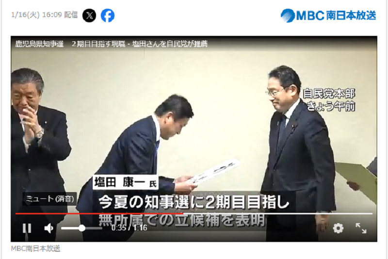 鹿児島県知事選 2期目目指す現職・塩田さんを自民党が推薦(MBC南日本放送よりシェア)