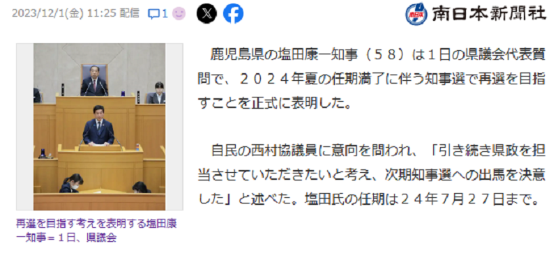 【速報】来夏の知事選 塩田康一知事が出馬を正式表明 鹿児島県議会